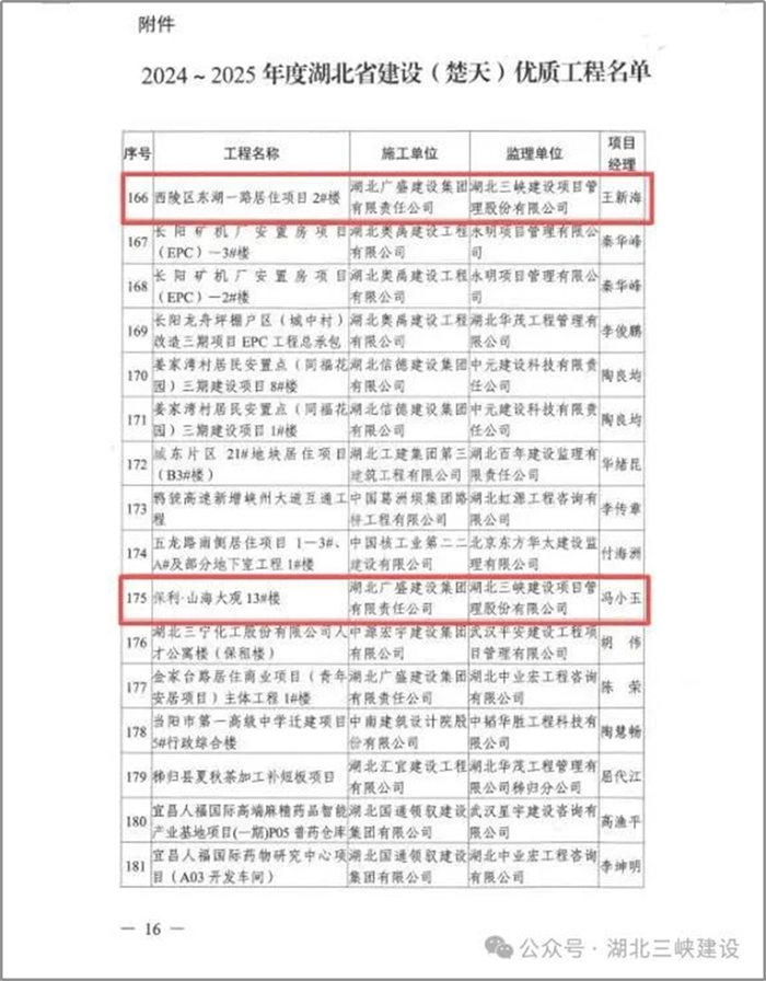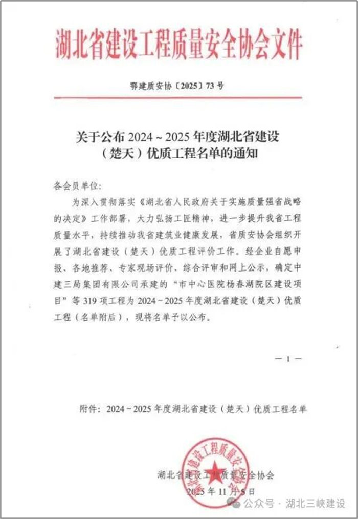 热烈祝贺我公司在2024-2025年度湖北省建设(楚天)优质工程名单中,湖北三峡建设项目管理股份有限公司(含原宜昌平湖工程建设监理有限责任公司)等5个项目荣获我省“楚天杯”!
